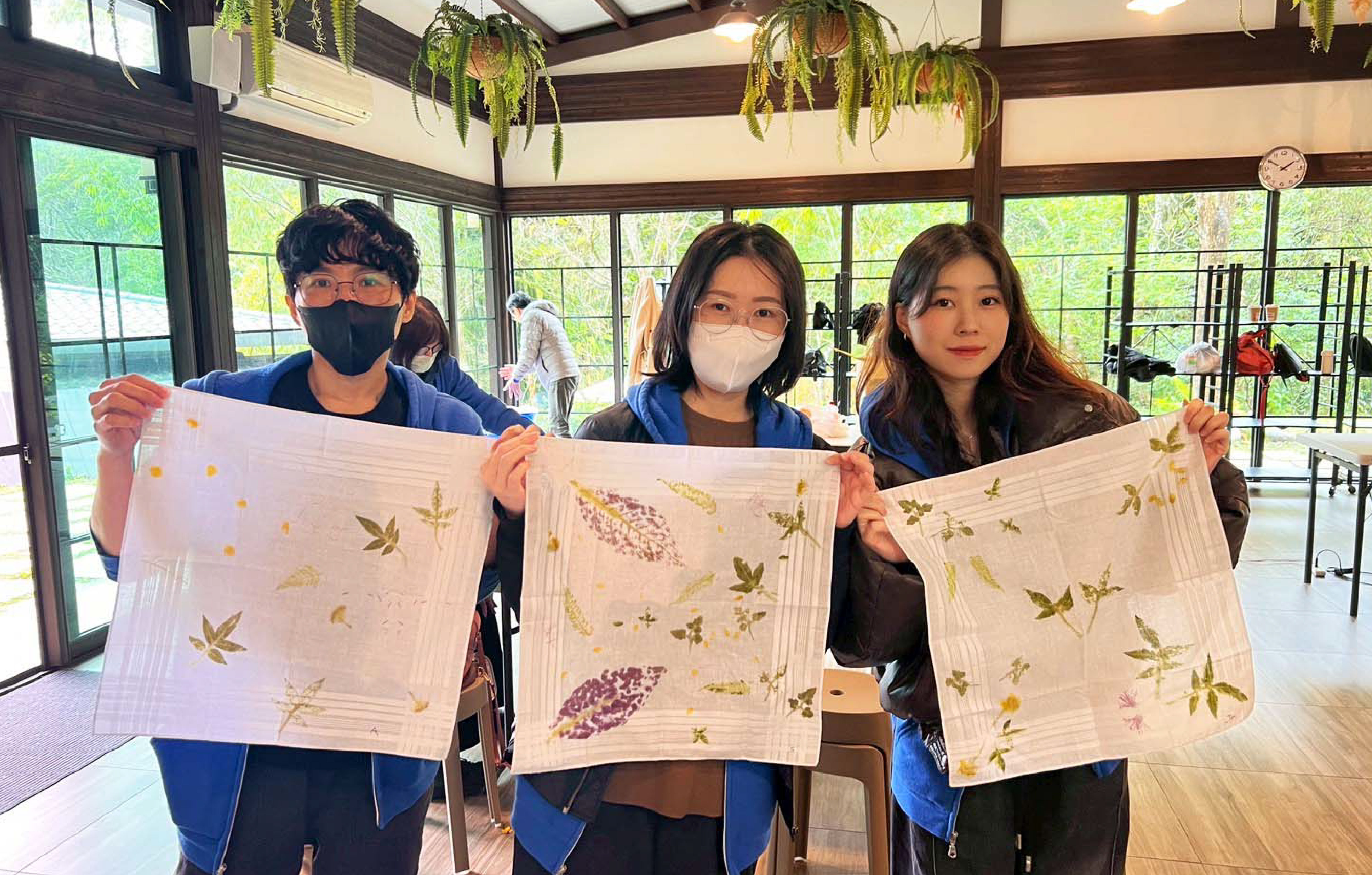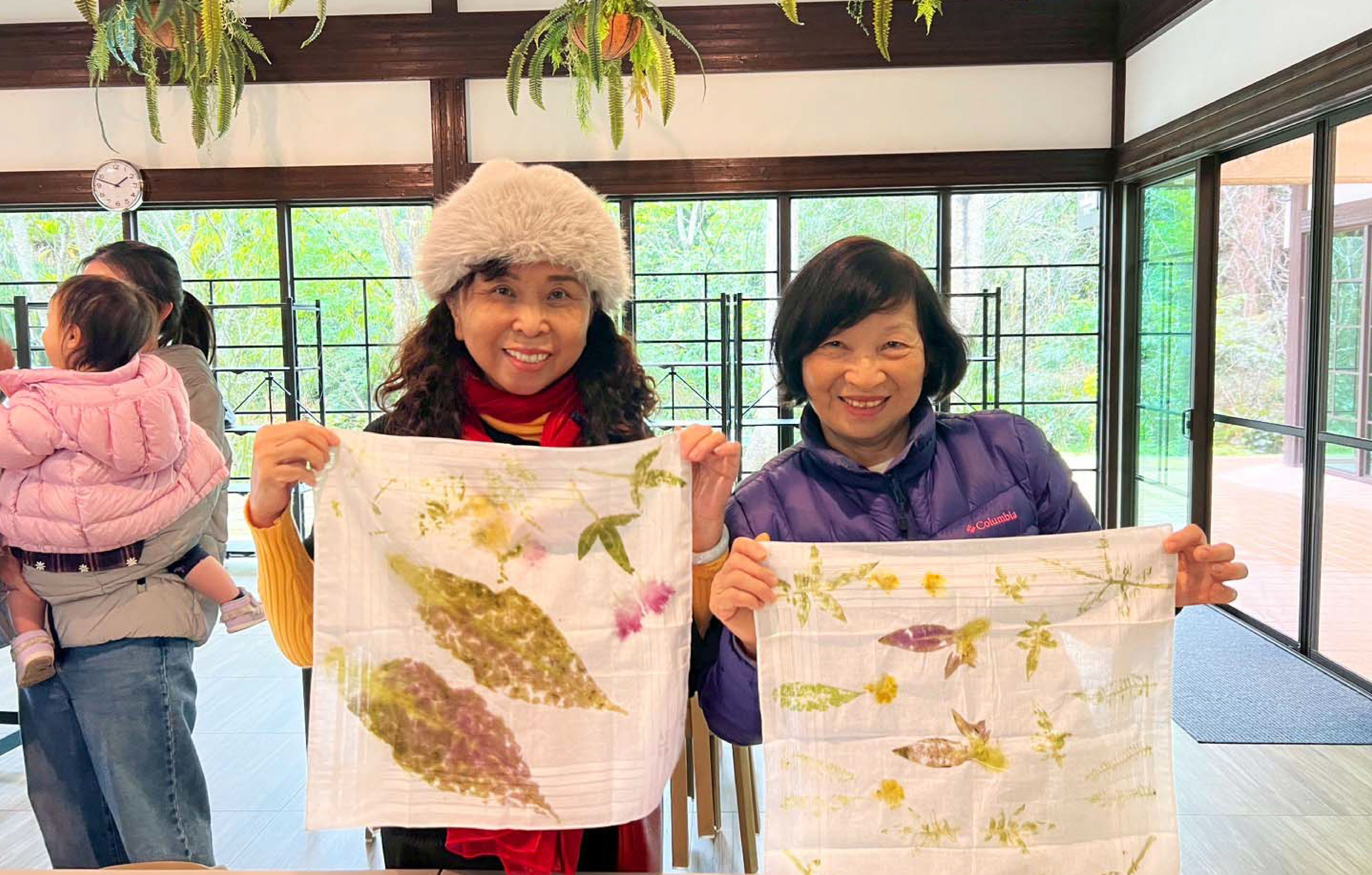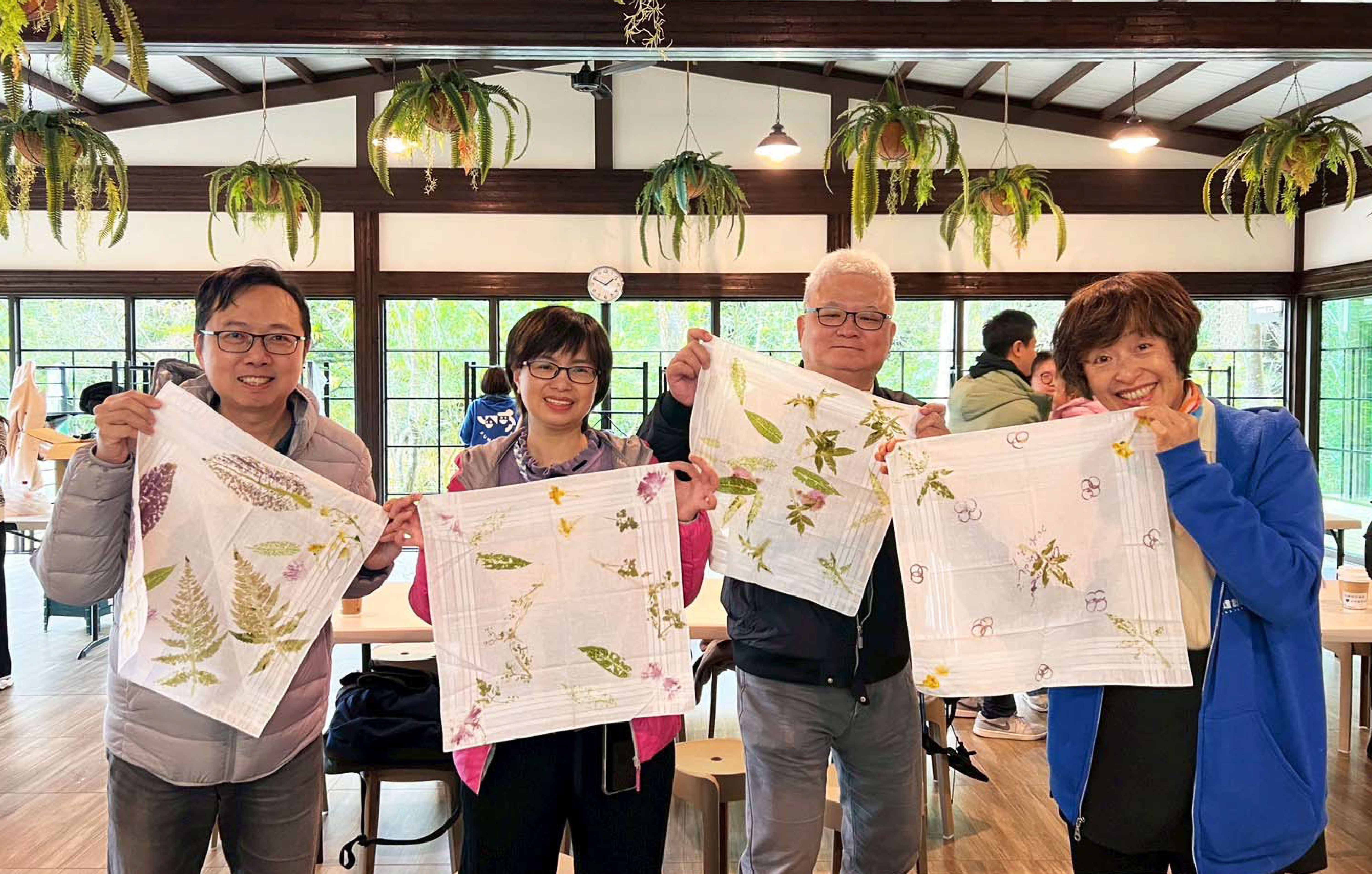 在葉拓染方巾的製作中,大家拿起小槌輕輕敲打,將山林中的花草、葉脈與樹液所交織出的自然色彩,細細印在布面上。